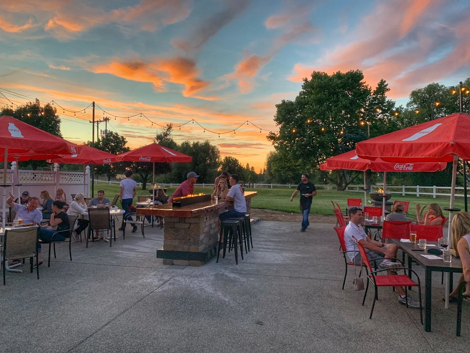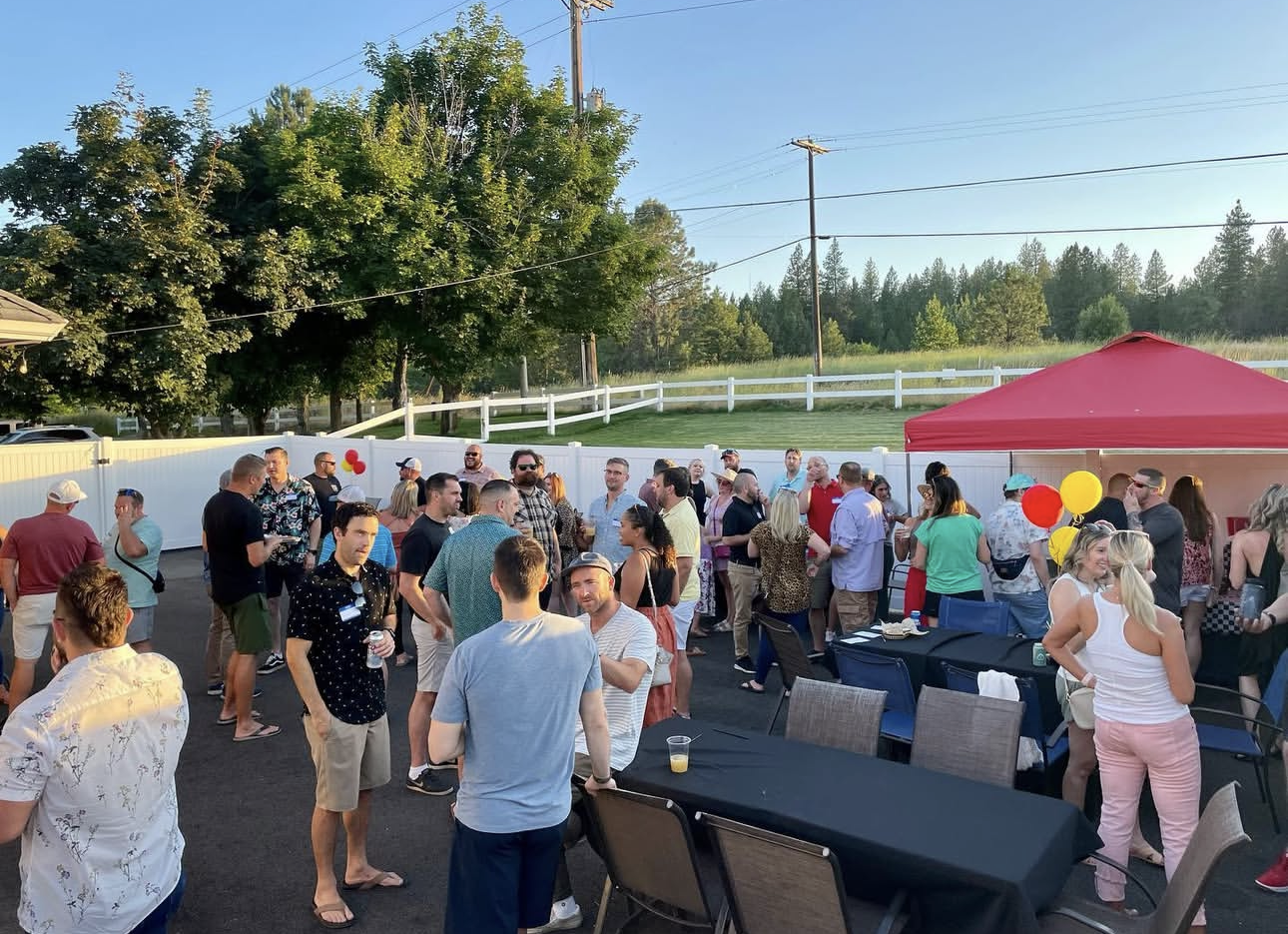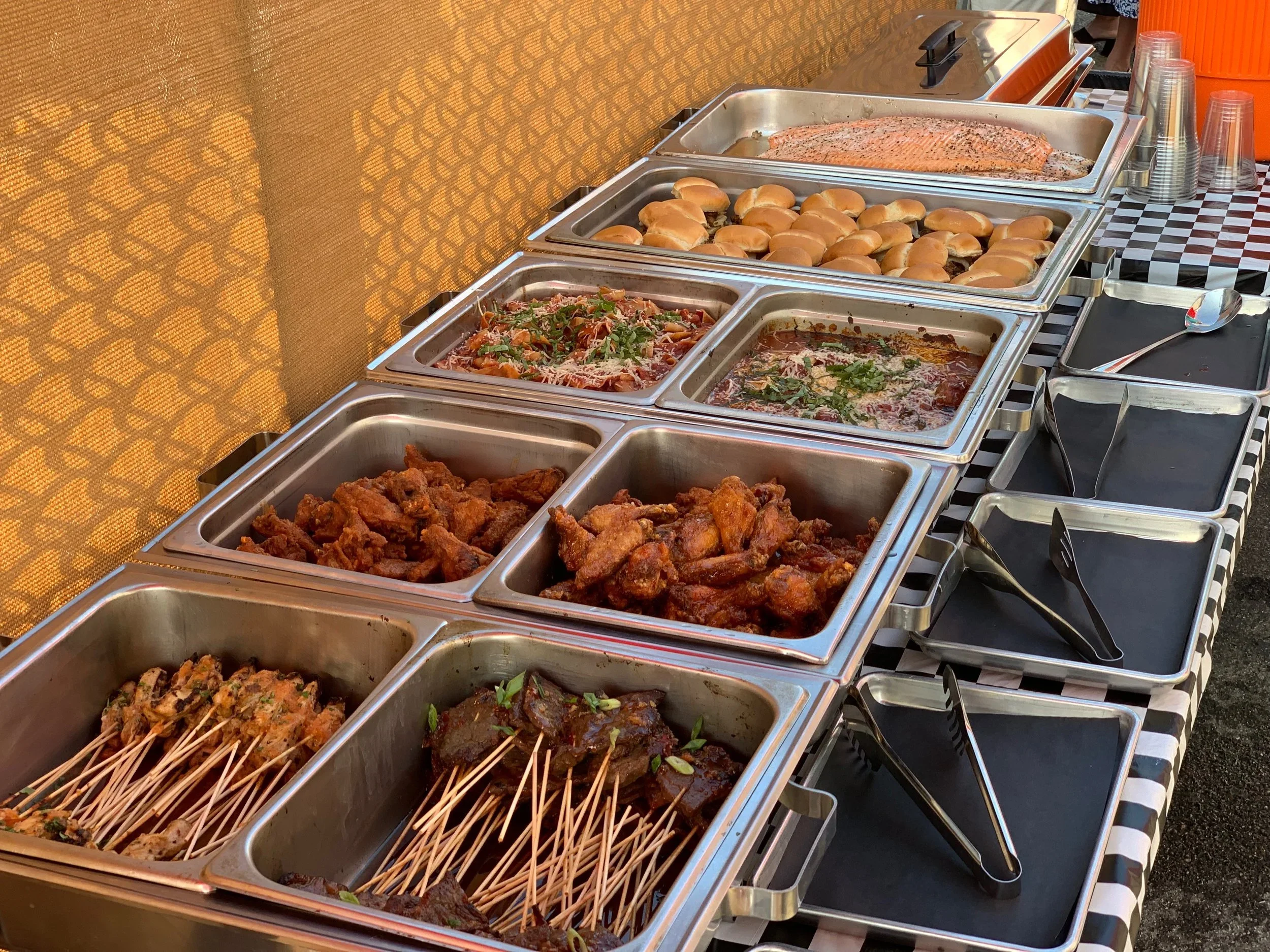 outdoor summertime side patio private event space. this is a casual gathering space for socializing for drinks and buffet food.